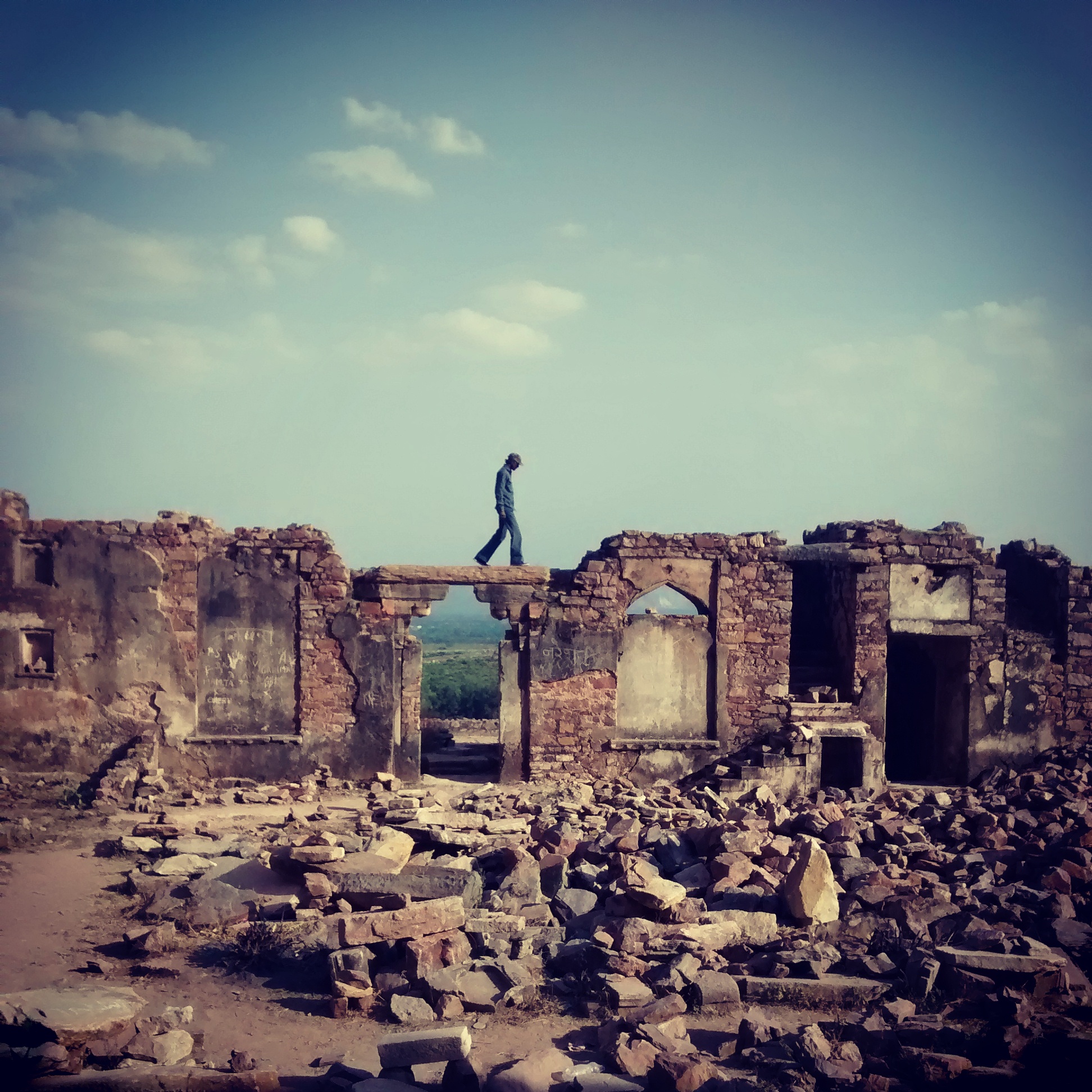 When I say ruin, I think of the Tughlaqabad Fort in Delhi. Beyond its formidable ramparts exist broken walls, distinct in their half-ness, as if they’ve sprung out of nowhere, jostling for space with the unwanted wild shrubs around.