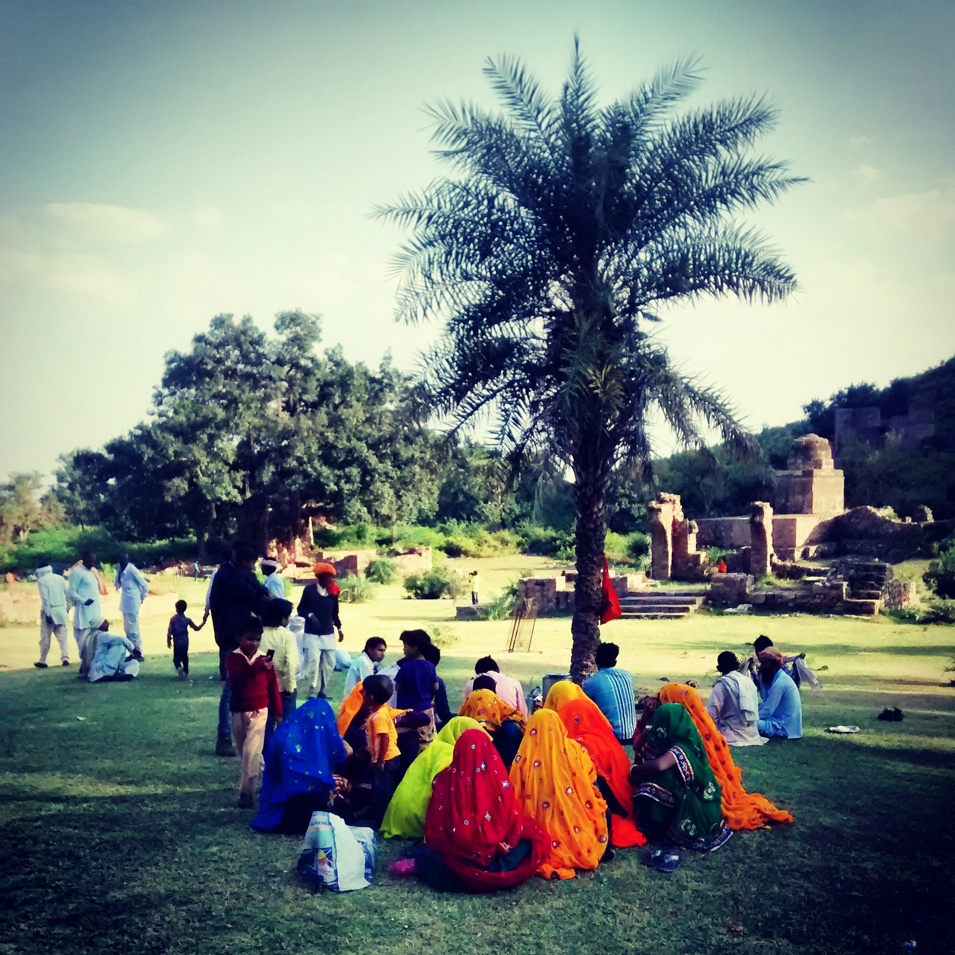 Under a tree, village women sing folk songs. Sitting next to them are probably their men, sharing a meal of dal baati churma, a popular Rajasthani dish. Elsewhere, lovers do what they’re good at! Families, as usual, create nuisance.