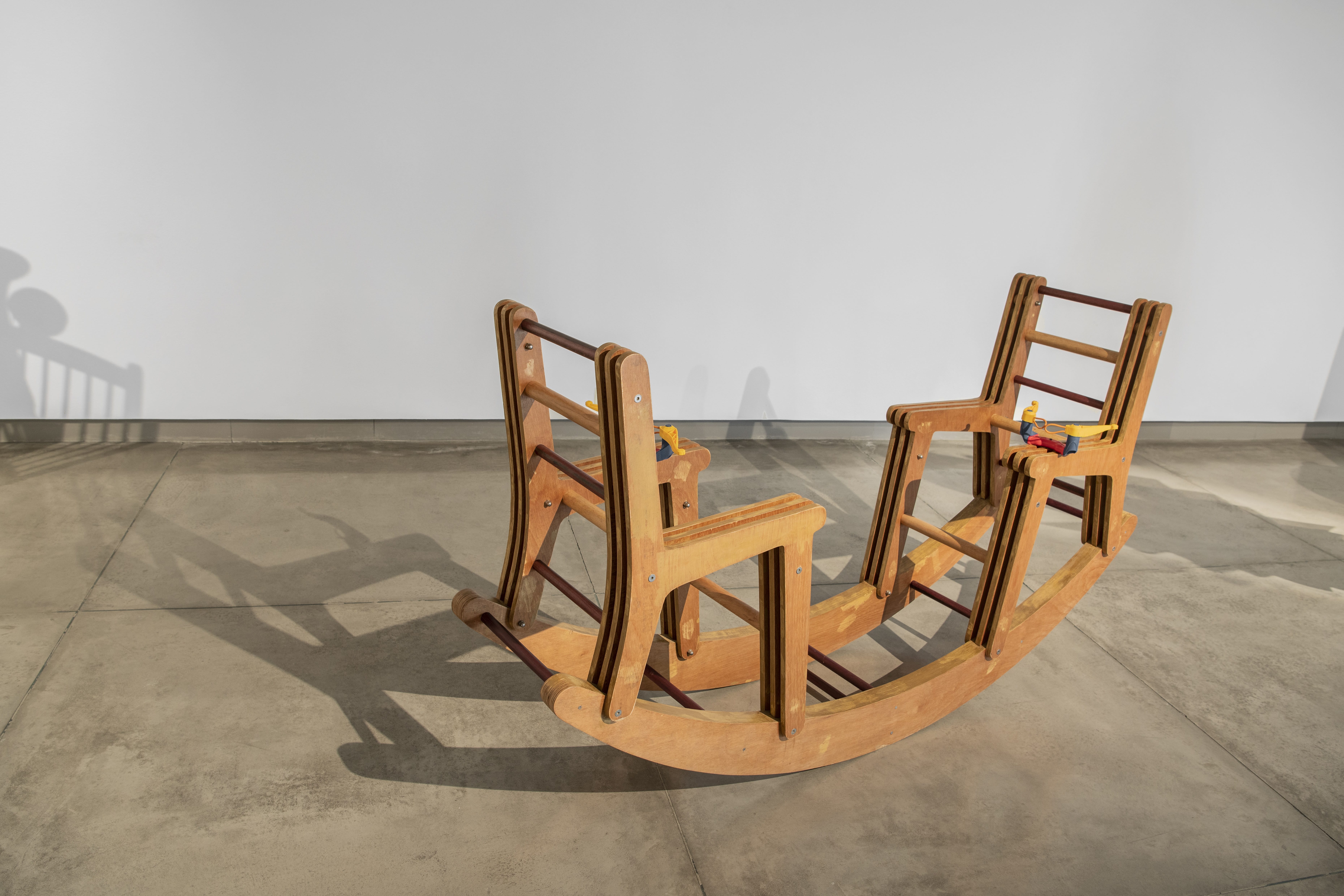 In the rest of the show, registers of memories and nostalgia are simultaneously evoked through quaint-looking exhibits such as ‘Sheet Music for Table Tennis’, an untitled work that shows a wooden violin, and a lonesome rocking chair called ‘Hours and Minutes’.