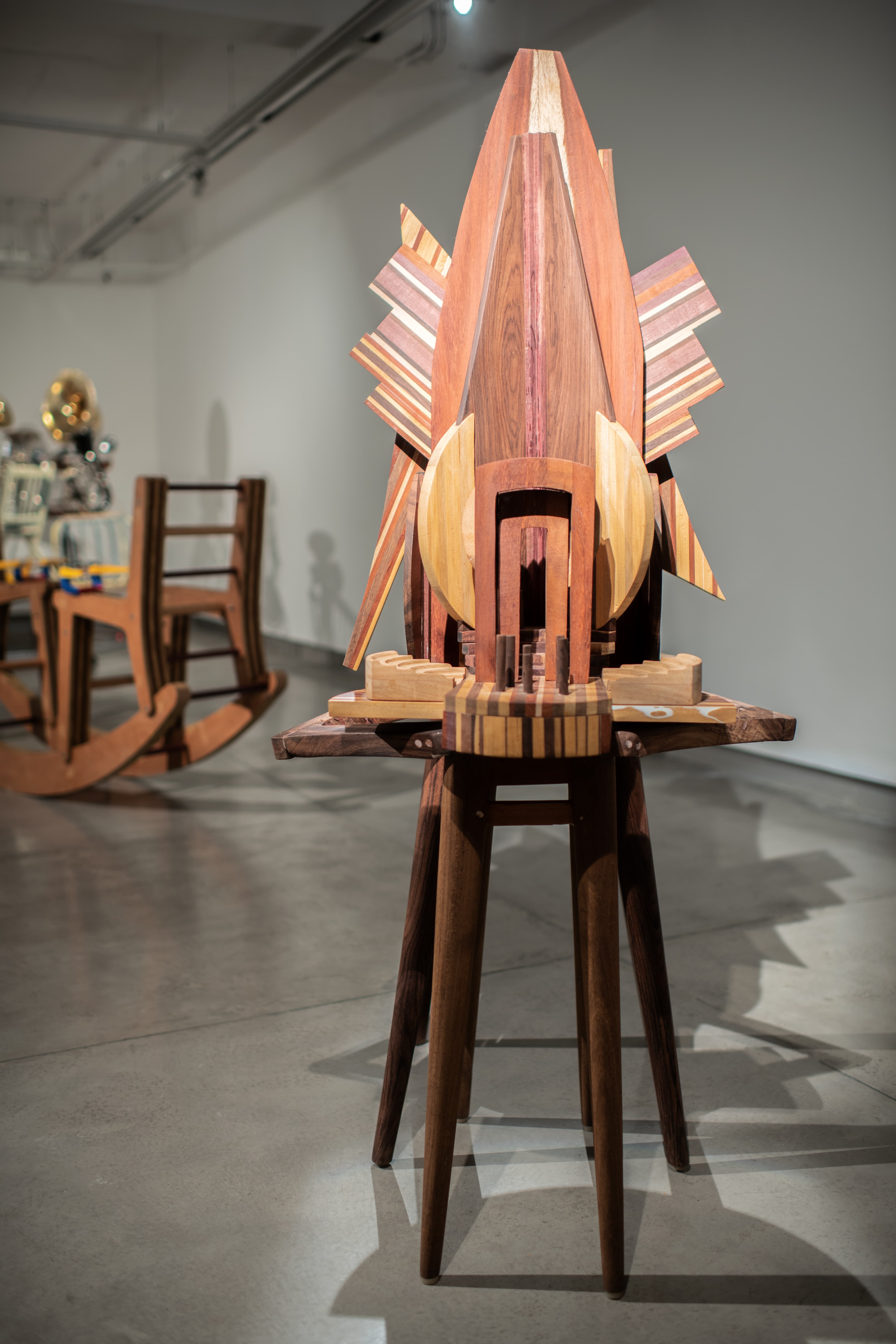 He demonstrates a wide range of experimentations in the form of sculpture, which is a challenging medium to work in, while he combines it with mixed media materials. The rendering of different sounds and the politics of responding to it form the spine of his latest work. The use of wood is pivotal, a material that is known for its acoustic properties or its ability to reflect sound.