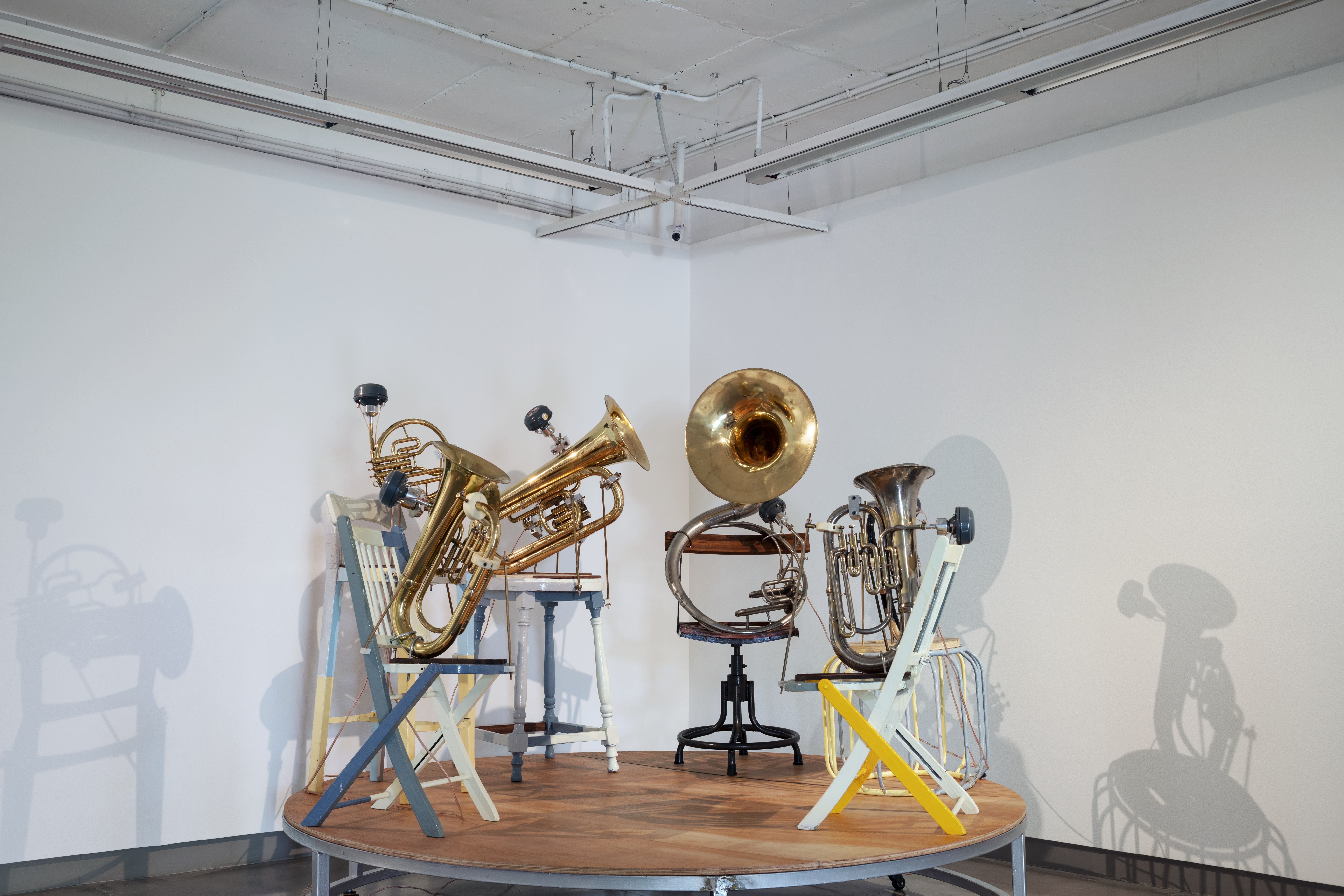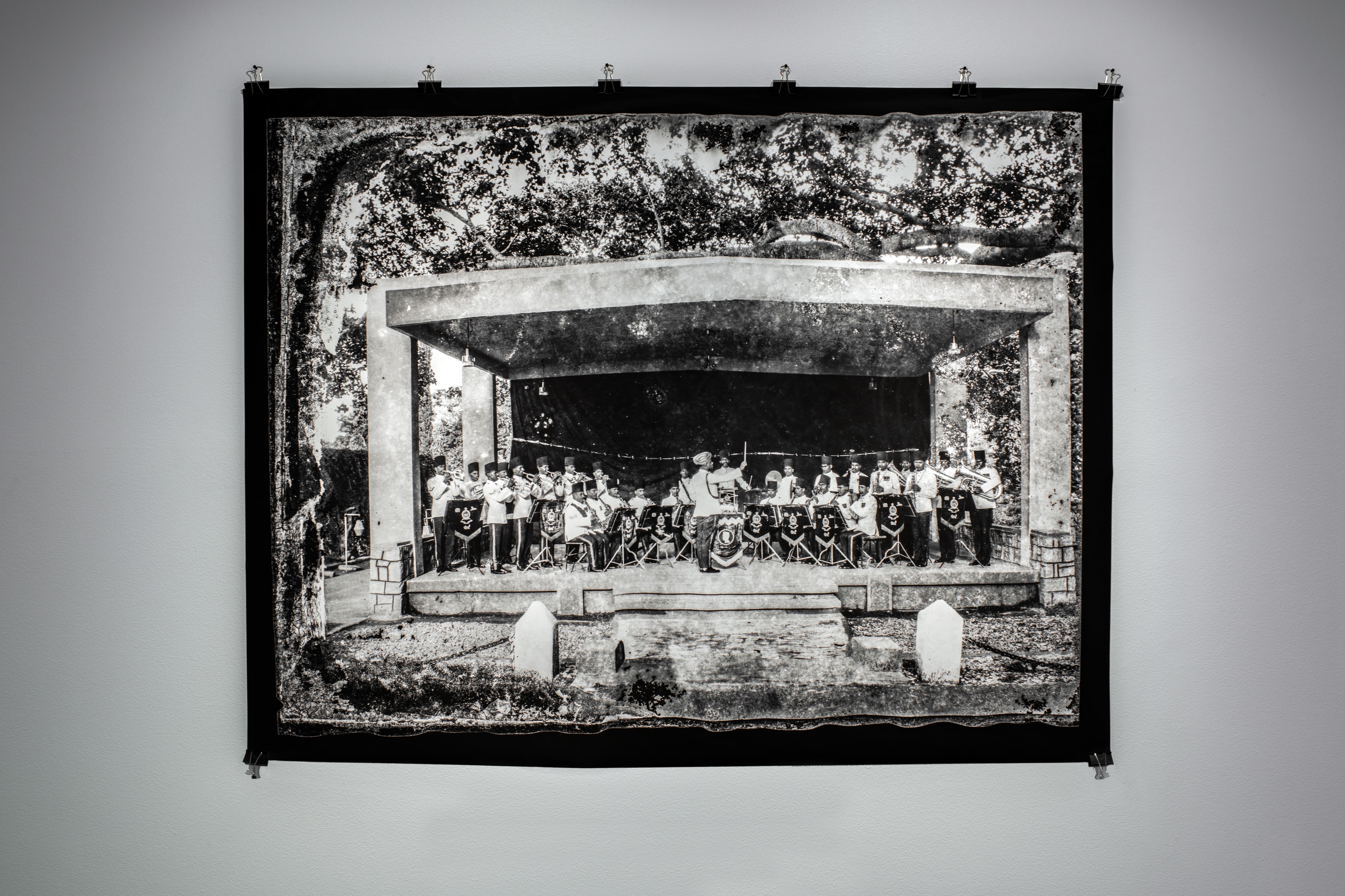 The most striking feature of the exhibition is a large sound sculpture, made up of six salvaged wind instruments, discarded by a local military brass band ‘Madras Snappers’. The installation, which is called “The Weather Report in 3 Parts by The Phantom Orchestra”, has three abstract background scores, each rendering an orchestra that is at once representing the search for a rhythm with oneself, moving onto sounds that reflect a chaotic, restless energy, and finally culminating in an ominous feeling. A black and white archival photograph of the Madras Snappers, which is part of the show, serves as a historical link to The Phantom Orchestra installation.