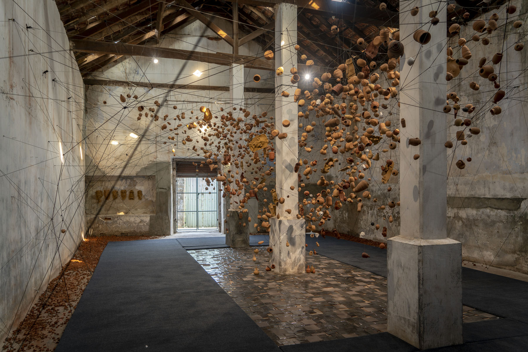 At the far end of the collateral venue, Kulkarni’s monumental site-specific installation explores the process of thoughts coming and going. Exhibiting numerous objects made out of terracotta, which have been tied together through ropes, the installation (titled ‘Thought’) creates a sense of something suspended in time.
