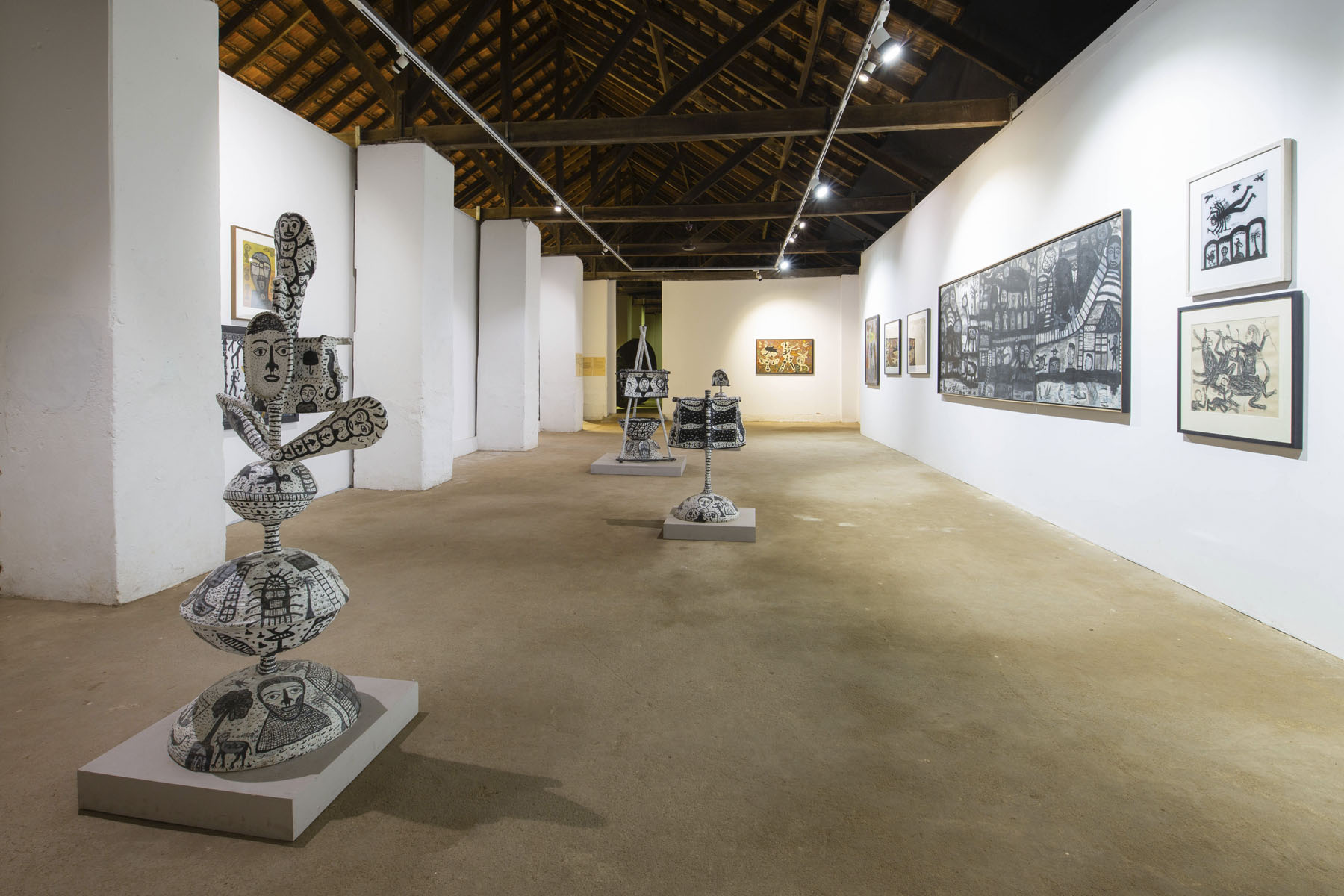 The artist’s biennale presentation, on view at the Aspinwall House in Fort Kochi, shows paintings made out of charcoal and acrylic, apart from sketches in ink. A large, three-panel painting, hung prominently in the exhibition, recreates rural life in a maze-like setting. In all her works, the form of the narrative is emphasized, establishing her as an artist-storyteller.
